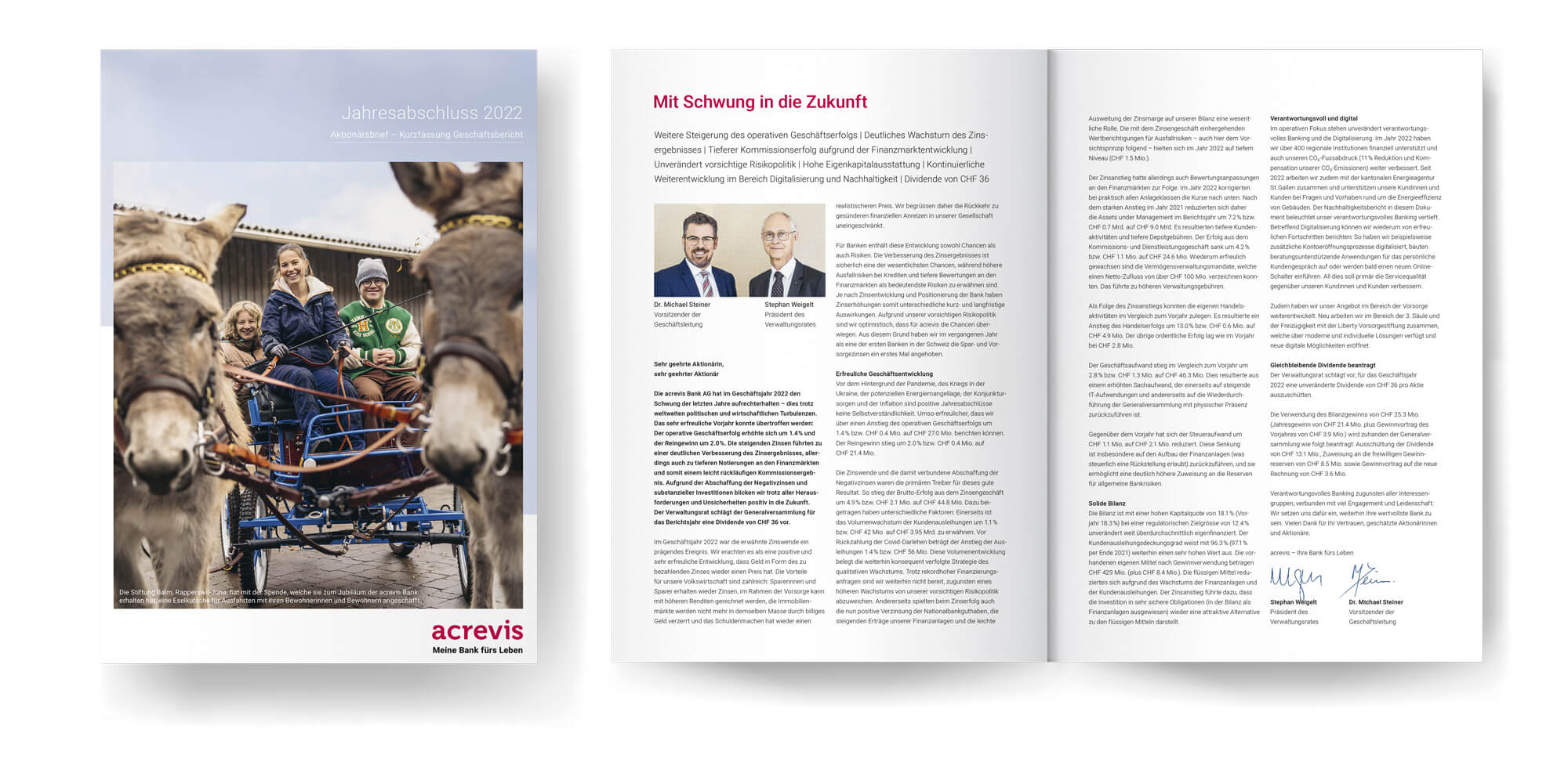 Nah am Kunden – Die Acrevis ist keine anonyme Grossbank. Sie kommuniziert persönlich und bedürfnisorientiert mit Jahresbericht, regelmässigen Finanztipps und Informationen.