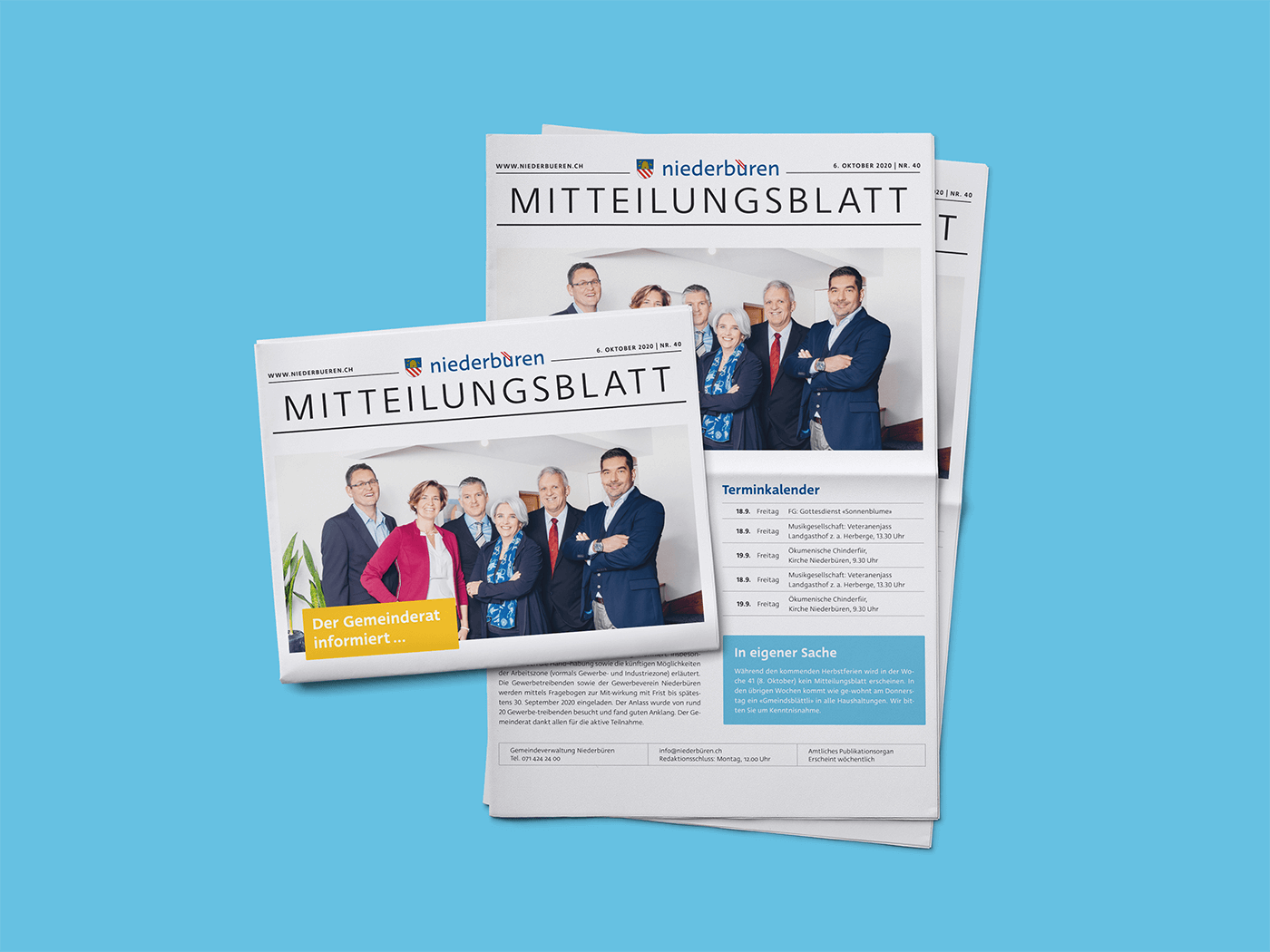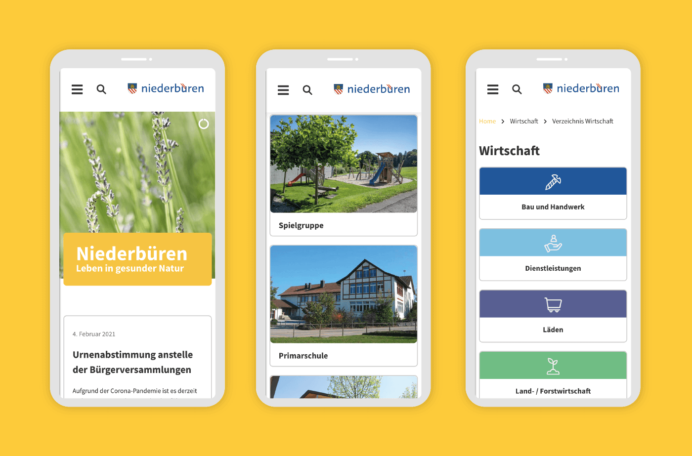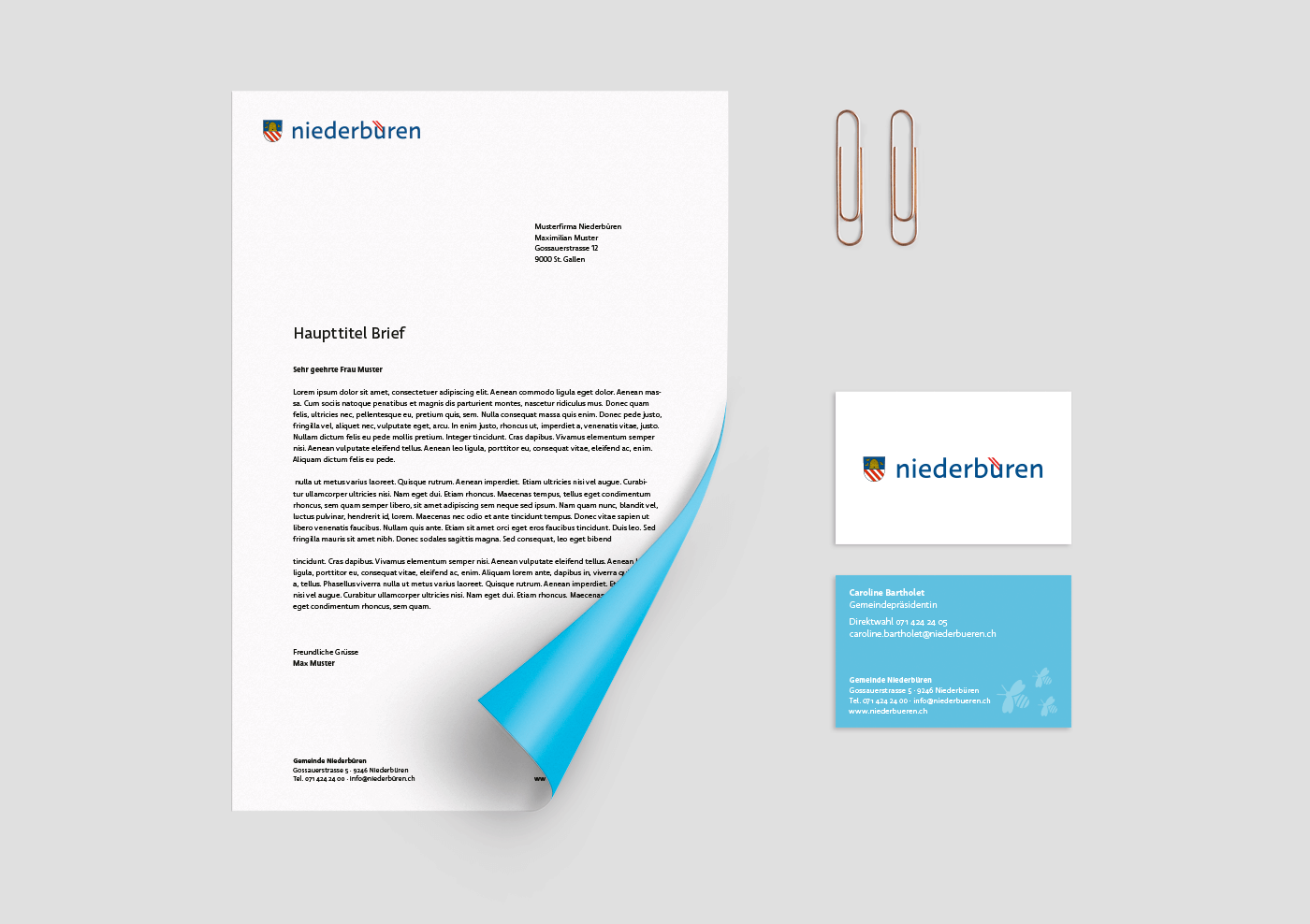Mit dem Ziel, ihre visuelle Identität zu schärfen und auf allen Kanälen ein einheitliches Erscheinungsbild zu gewährleisten, haben die Cavelti AG und die Agentur Kernbrand gemeinsam mit Niederbüren das Corporate Design überarbeitet. Nach einem intensiven Workshop wurde der Auftritt der Gemeinde präzisiert und auf die relevanten Kommunikationskanäle ausgerollt. Das Ergebnis überzeugt!